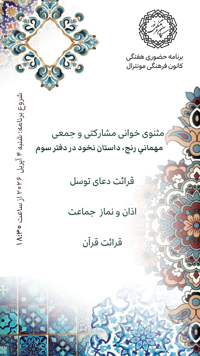 Weekly gathering – April 4 + Add to Google Calendar + iCal / Outlook export 00 days 00 hours 00 minutes 00 seconds Date Apr 04 2026 Time 6:30 pm - 9:00 pm Location کانون فرهنگی نور مونترال Other Locations Category Weekly gathering Share this event
